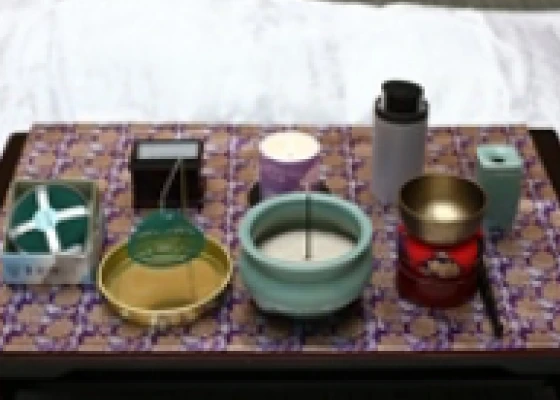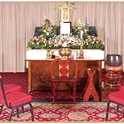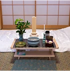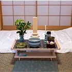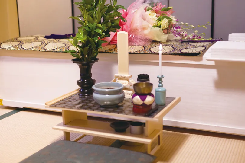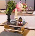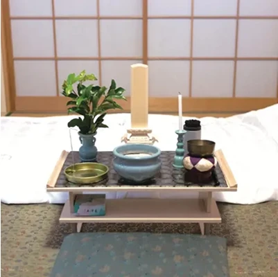 故人様をご安置中、お参りの際に使用する簡易的な祭壇です。ご宗派に応じてお飾りいたします。経机、三具足、線香、ローソク等。